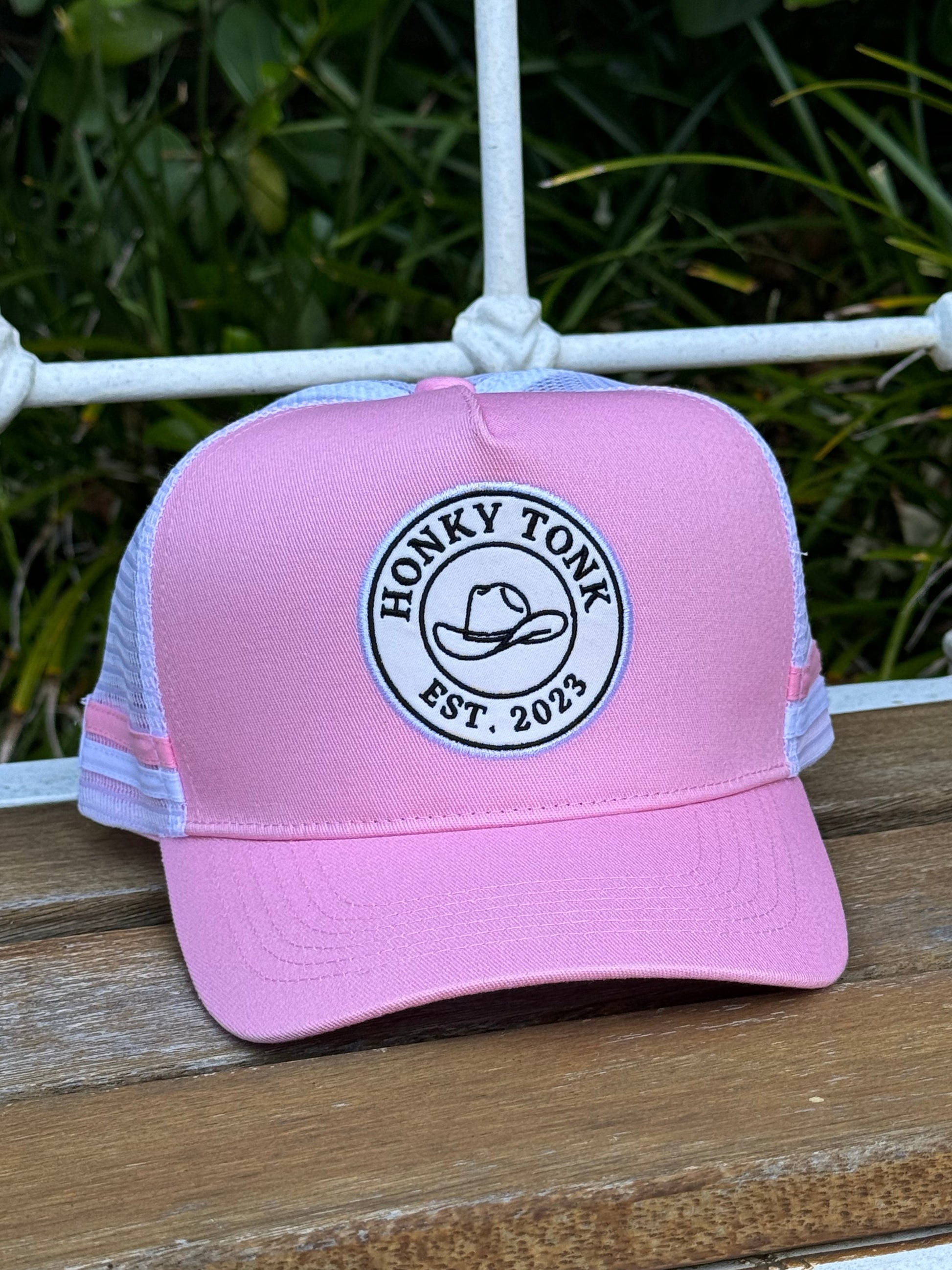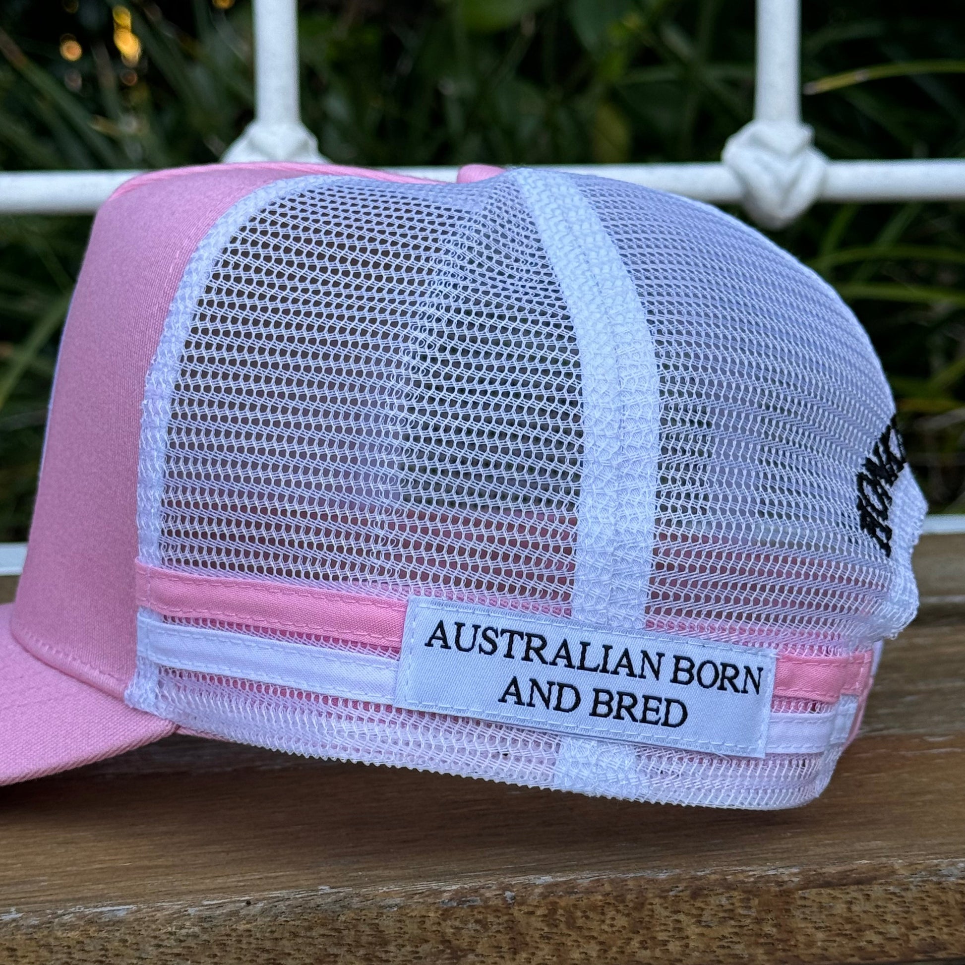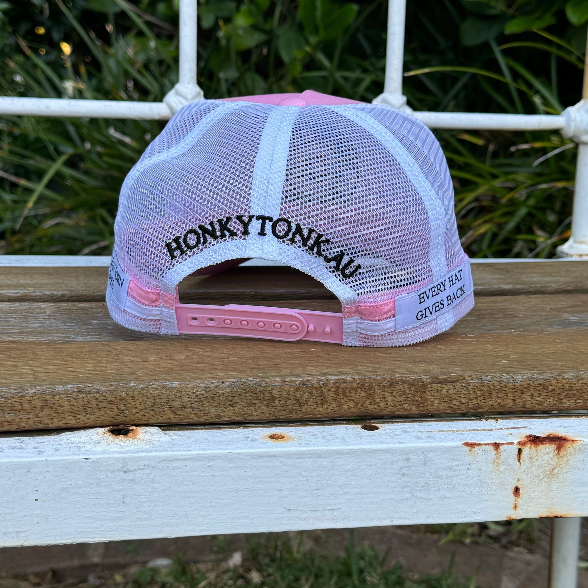 Elevate your look with our 'Honky Tonk Trucker Cap - Pink', designed for those who appreciate both style and substance. The front showcases a striking black and white embroidered circle logo that contrasts beautifully with the soft pink. Two elegant stripes wrap around the cap, complemented by meaningful labels on each side: "Every Cap Gives Back" and "Australian Born and Bred." This cap not only looks good but does good too. The mesh design ensures your head stays cool with plenty of airflow. The snapback closure allows for a customisable fit, making it comfortable for everyone. Our website domain is carefully embroidered on the back, adding a finishing touch. One size fits all.