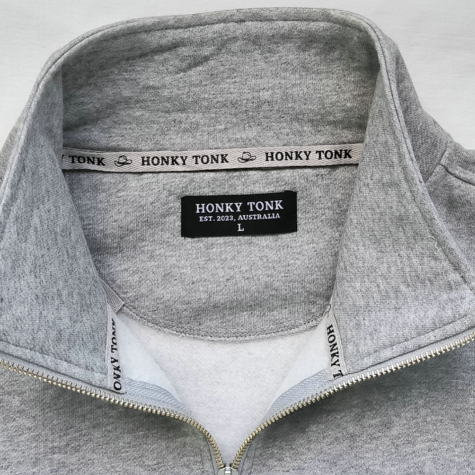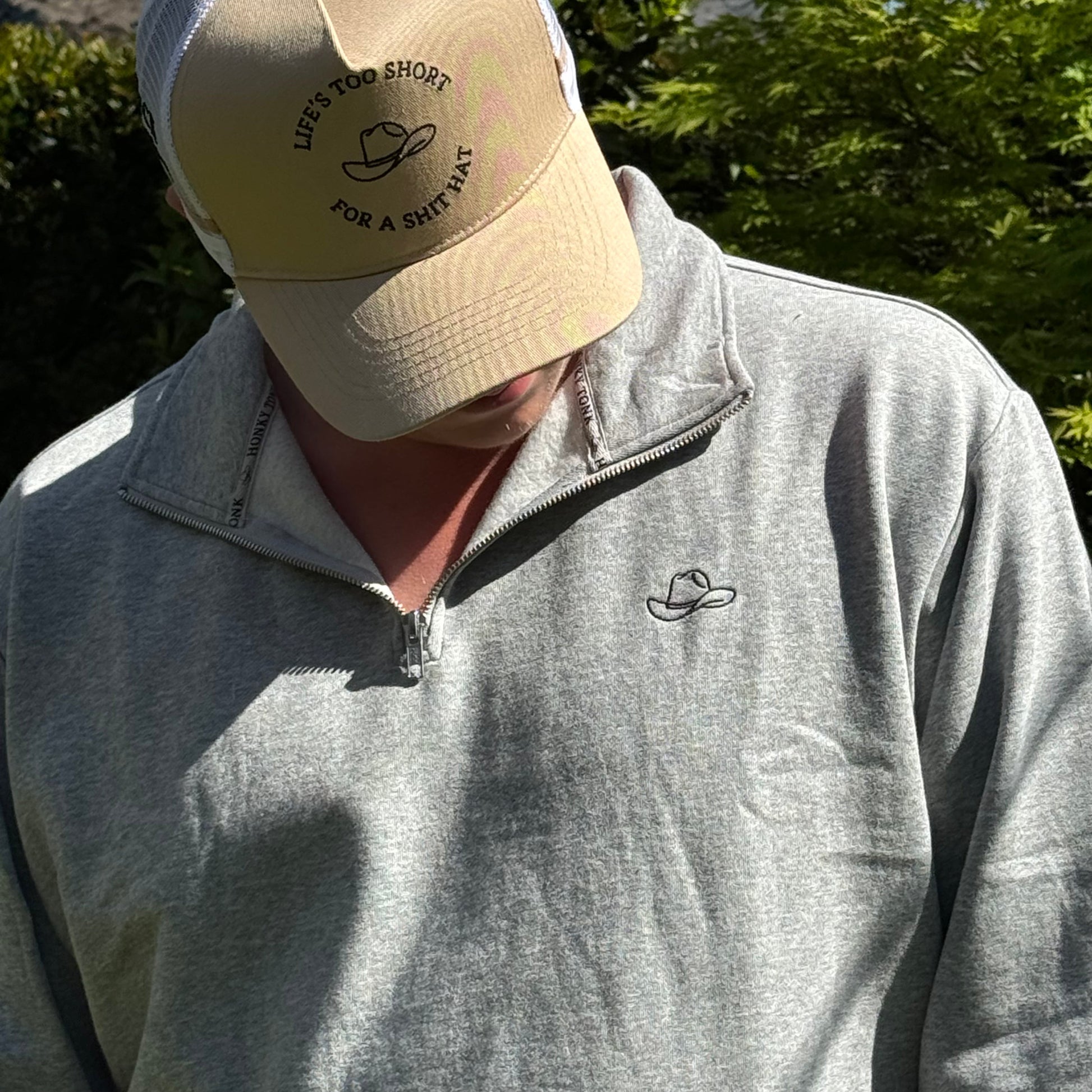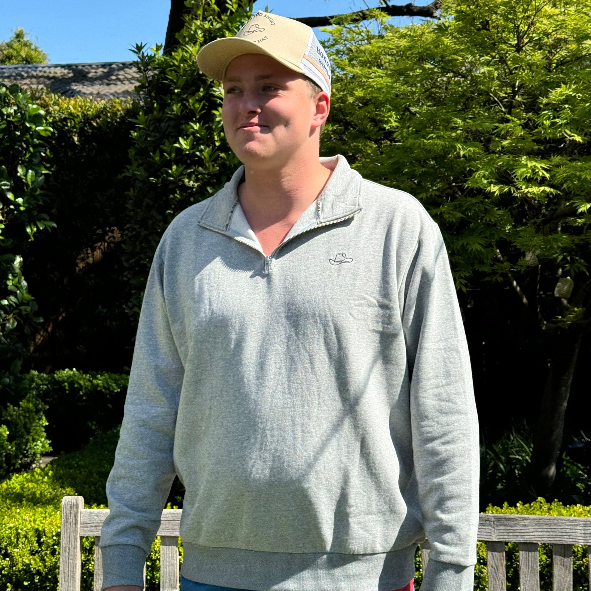 Keep it cool and classic with the 'Men's Quarter Zip - Grey'. Made from a durable cotton-polyester blend (300gsm, 80% Cotton, 20% Polyester brushed fleece) with a soft cotton jersey lining, this jumper offers the perfect combination of warmth and comfort. The minimalist grey design is complemented by our embroidered cowboy hat logo on the front chest, adding a subtle touch of style.