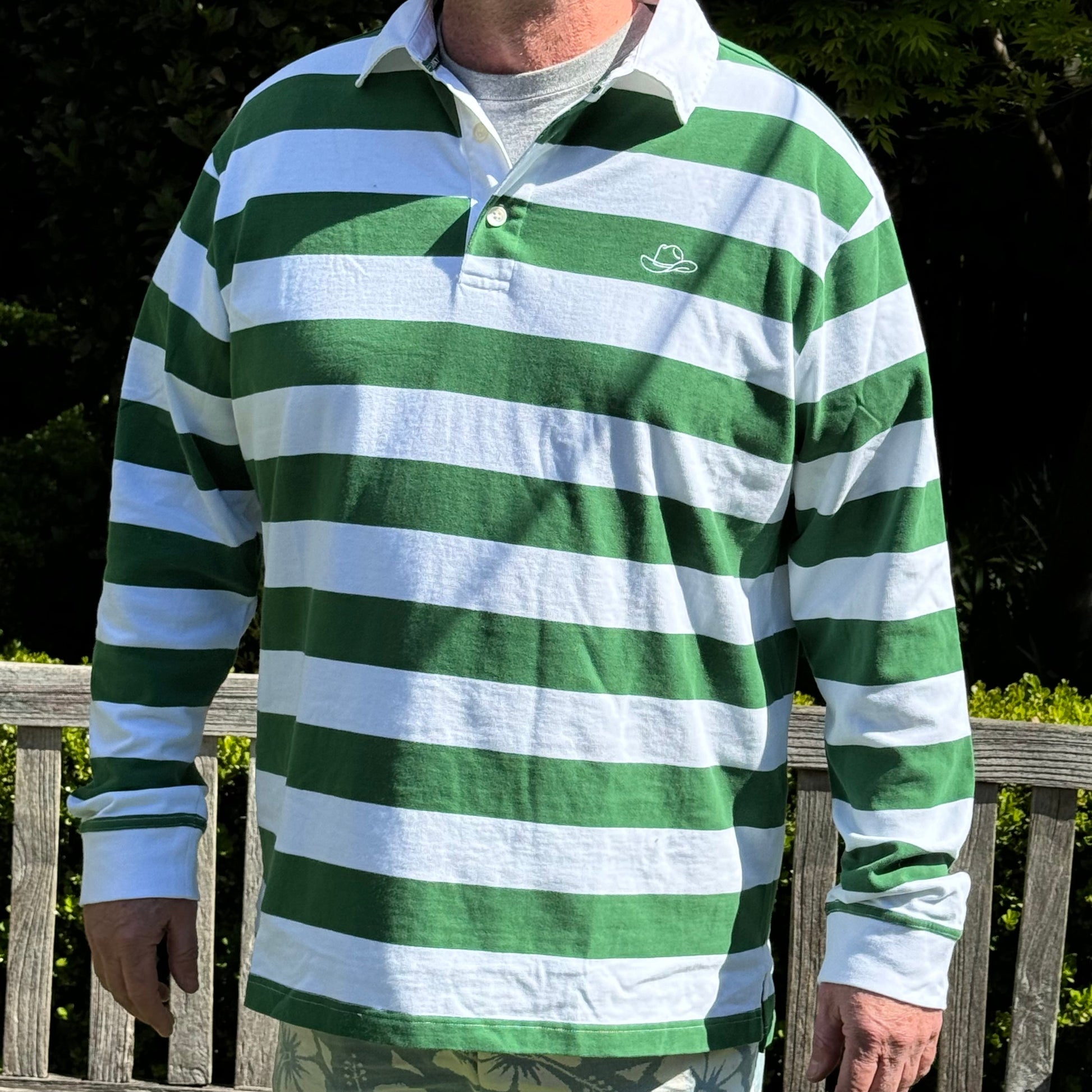 Add a touch of boldness to your wardrobe with the 'Men's Stripe Rugby - Green'. Made from premium cotton rugby knit (300gsm), this jumper combines comfort and durability. The green and white stripe pattern is complemented by our iconic cowboy hat logo embroidered on the chest, adding a subtle nod to the brand's heritage.
