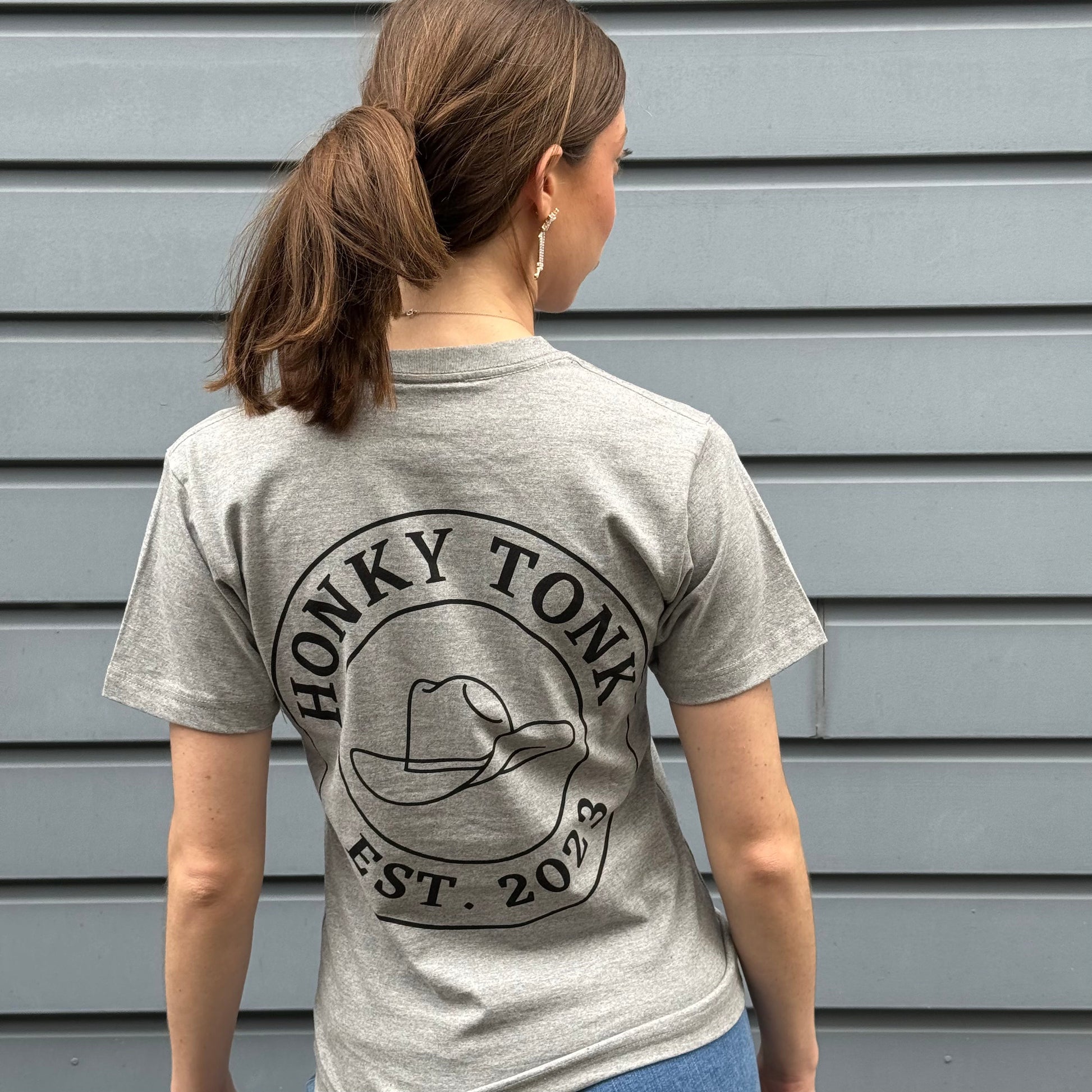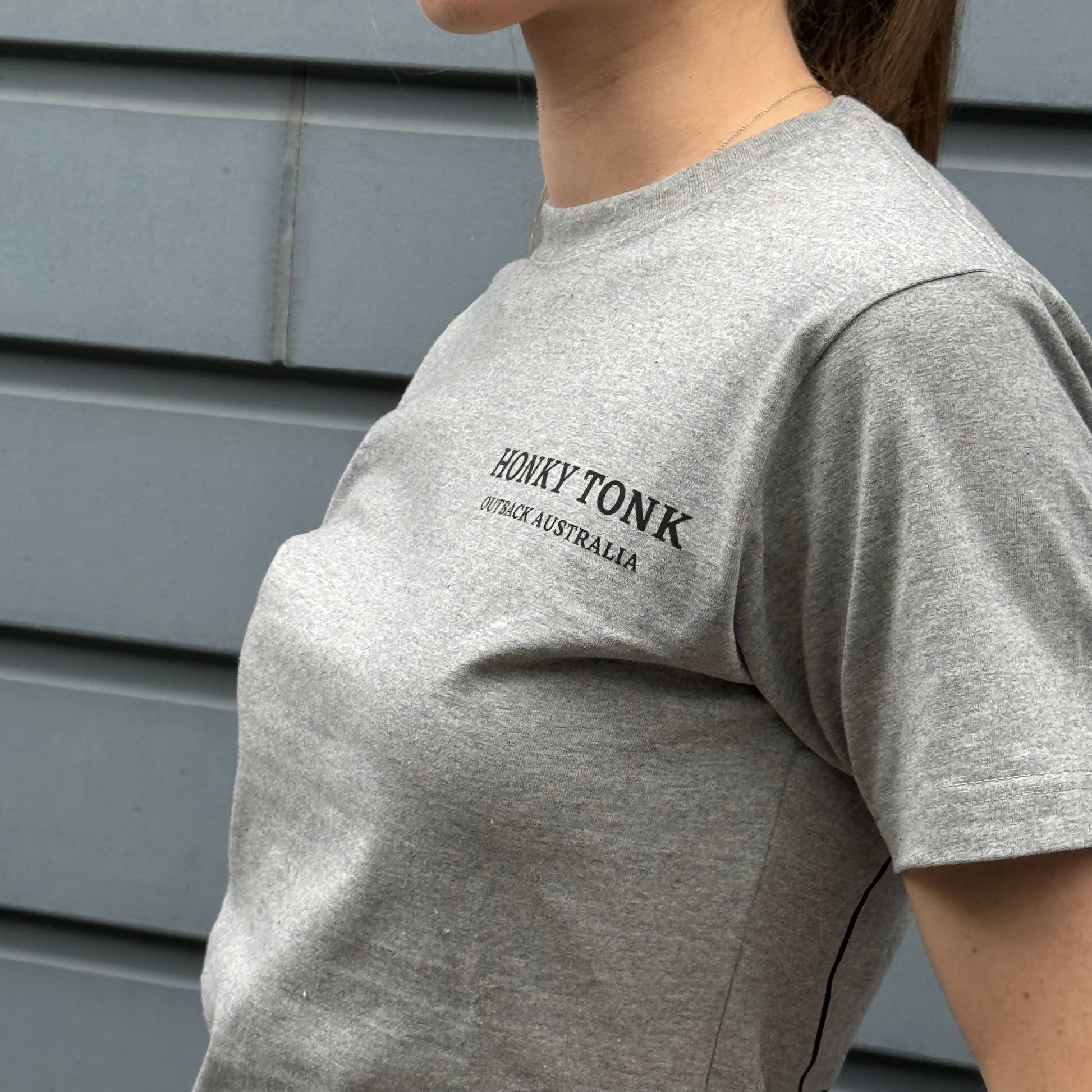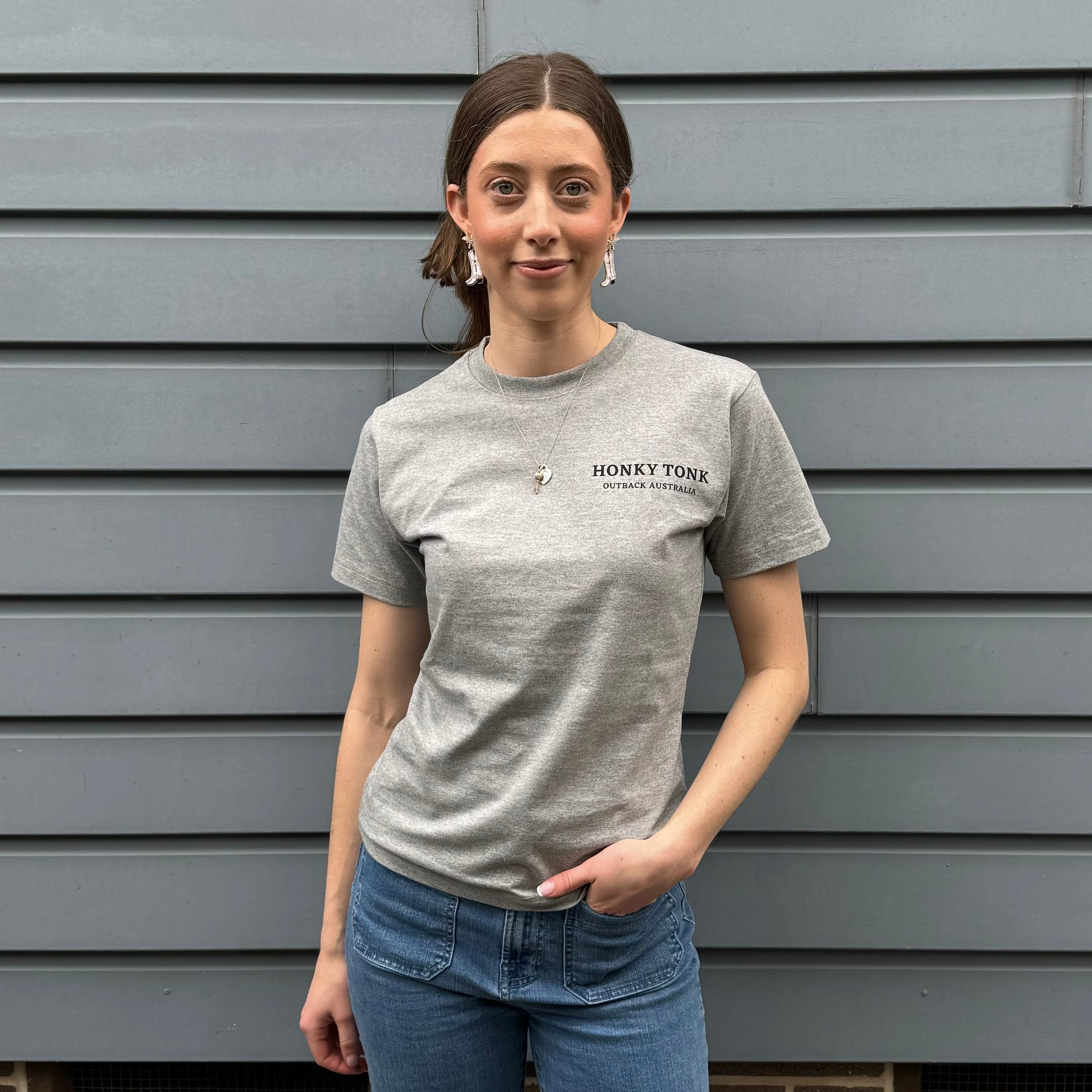 The Women's Grey T-Shirt combines comfort and rugged style, with our "Honky Tonk, Outback Australia" logo printed in black on the front chest. This 230gsm, 100% cotton crew neck tee is soft and breathable, yet still provides necessary warmth on those cooler days. Pre-shrunk to minimise shrinkage. The large brand logo on the back completes the look, making it a versatile choice for any casual occasion.