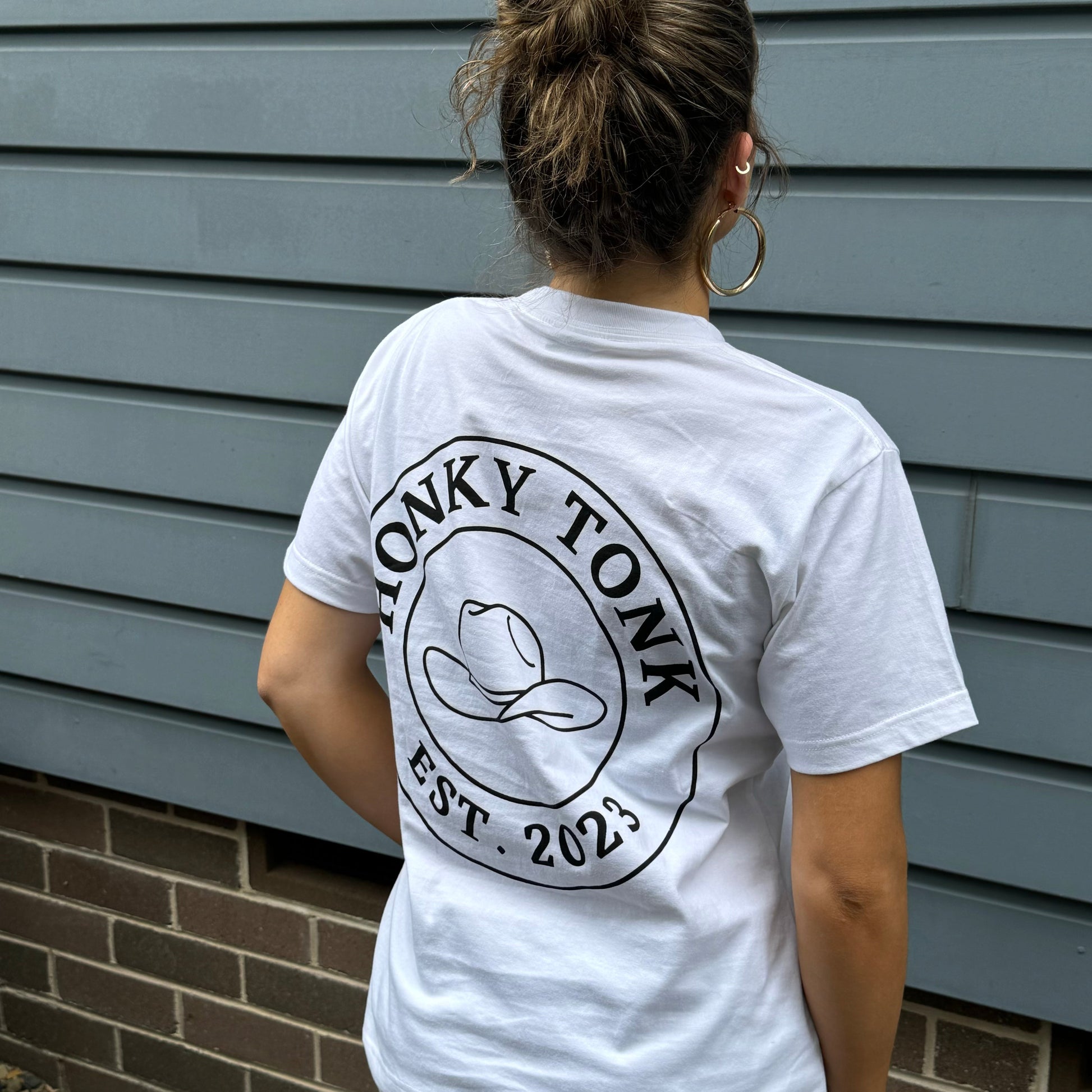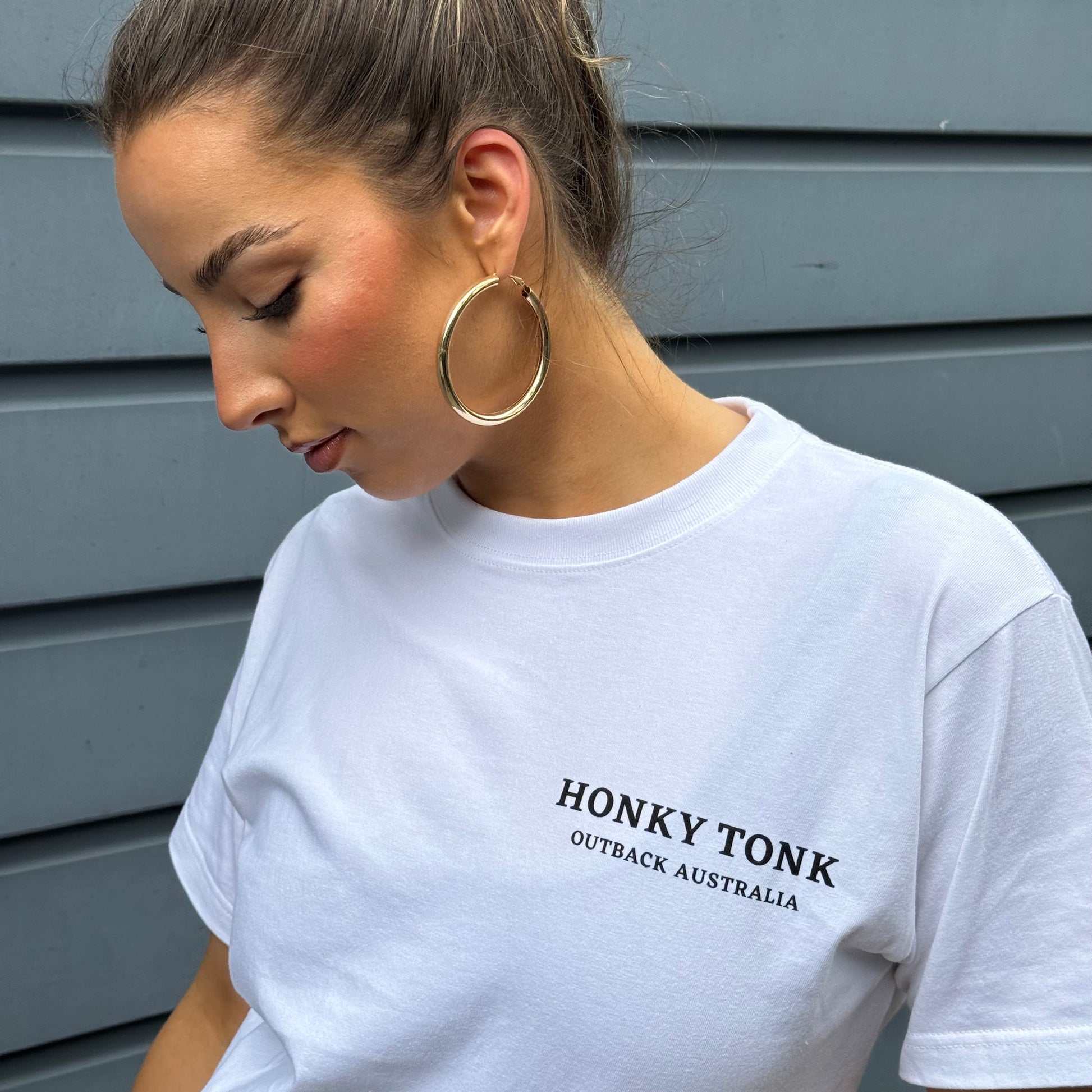 The 'Women's Signature Tee - White' offers timeless appeal, with our "Honky Tonk, Outback Australia" logo printed in black on the front chest. Made from 100% cotton (230gsm), this tee is designed for softness, breathability, and durability. With a large brand logo printed on the back and pre-shrunk fabric, this crew neck tee is made for comfort and style.